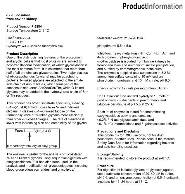 | 196571 | F5884 | α-L-岩藻糖苷酶,来源于牛肾 | α-L-Fucosidase from bovine kidney | 美国 | 1UN,≥2.0 units/mg protein (biuret) | 咨 询 |