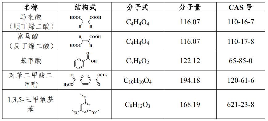 【特性量值】马来酸(顺丁烯二酸)按 C4H4O4计,含量为 99.8%; 富马酸(反丁烯二酸)按 C4H4O4计,含量为 99.9%;苯甲酸按 C7H6O2 计,含量为 100.0%;对苯二甲酸二甲酯按 C10H10O4计,含量为 100.0%; 1,3,5-三甲氧基苯按 C9H12O3计,含量为 99.9%。