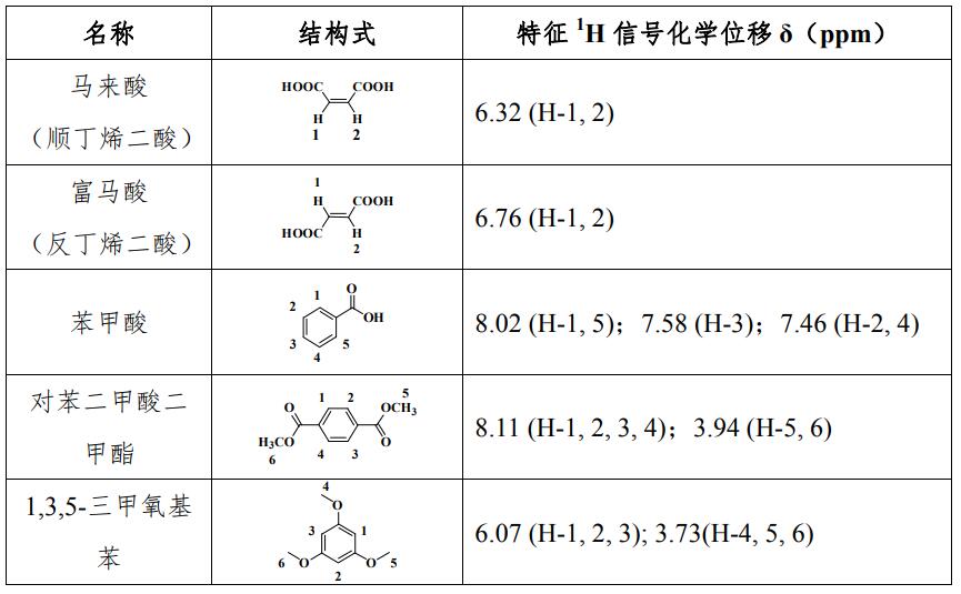 【组成】本套内标物由马来酸(顺丁烯二酸)、富马酸(反丁烯二酸)、 苯甲酸、对苯二甲酸二甲酯、1,3,5-三甲氧基苯共五种化学对照品组 成。