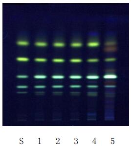 (S.从下到上依次为盐酸药根碱、盐酸巴马汀、盐酸小檗碱、表小檗碱、盐酸黄连碱对照品。1~3.黄连对照提取物,4.黄连对照药材,5.黄连上清片)