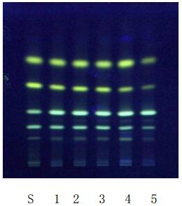 取本品约 10mg, 加入甲醇 10ml, 超声提取 15 分钟, 过滤, 取续滤液作为供试品溶液。 取盐酸小檗碱对照品、 盐酸药根碱对照品、 盐酸巴马汀对照品、 盐酸黄连碱对照品、 表小檗碱对照品, 分别加甲醇制成每 1ml 含 0.1mg 的溶液, 作为对照品溶液。 另取黄连对照药材1g, 同法制成对照药材溶液。 照薄层色谱法(中国药典 2015 年版通则 0502) 试验, 吸取上述供试品溶液、 对照品溶液各 2μl, 分别点于 同 一 硅 胶 G 薄 层 板 上 , 以 乙 酸 乙 酯 - 甲 醇 - 异 丙 醇 - 氨 水(5:2:1.5:1.2) 为展开剂, 置于氨蒸汽饱和的展开缸内, 展开, 取出, 晾干, 置紫外光灯(365nm) 下检视。 供试品色谱中, 在与对照品色谱和对照药材色谱相应的位置上, 显相同颜色的荧光斑点。 谱图见图 1、 图 2: