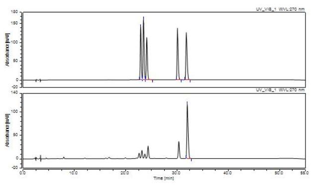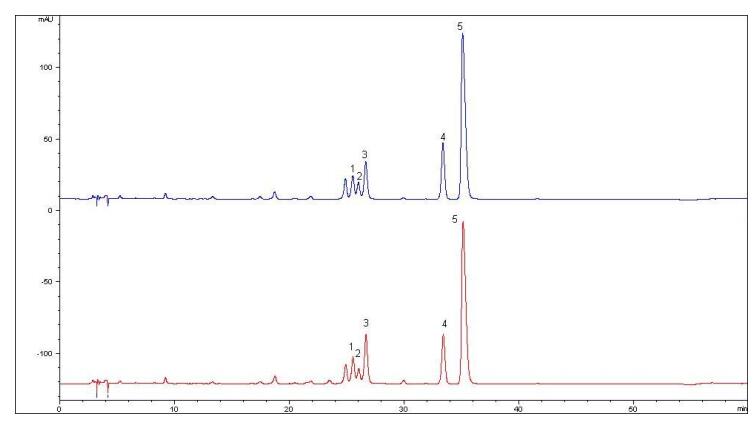 图3盐酸药根碱、盐酸巴马汀、盐酸小檗碱、表小檗碱、盐酸黄连碱混合对照品(上)及黄连对照提取物(下)HPLC色谱图