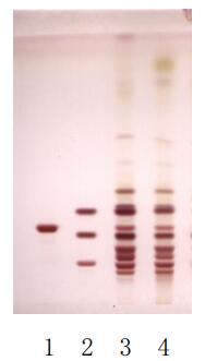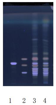 (1、人参皂苷 Rd,2、混标:从上到下依次为人参皂苷 Rg1、Re、Rb1,3、 人参对照药材,4、人参对照提取物)