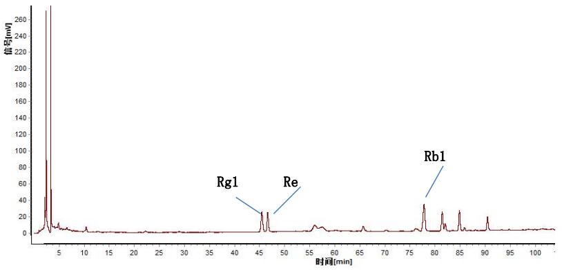 2、特征图谱 取本品约 30mg,置 10ml 量瓶中,加甲醇溶解并稀释至刻度,作为供试品溶液。另称取人参皂苷 Rg1 对照品、人参皂苷 Re 对照品及 人参皂苷 Rb1 对照品,加甲醇制成每 lml 各含 0.2mg 的混合溶液,摇 匀,作为对照品溶液。分别吸取对照品溶液与供试品溶液各 10μl, 注人液相色谱仪,测定,记录色谱图,即得。人参对照提取物色谱图 见图 2。