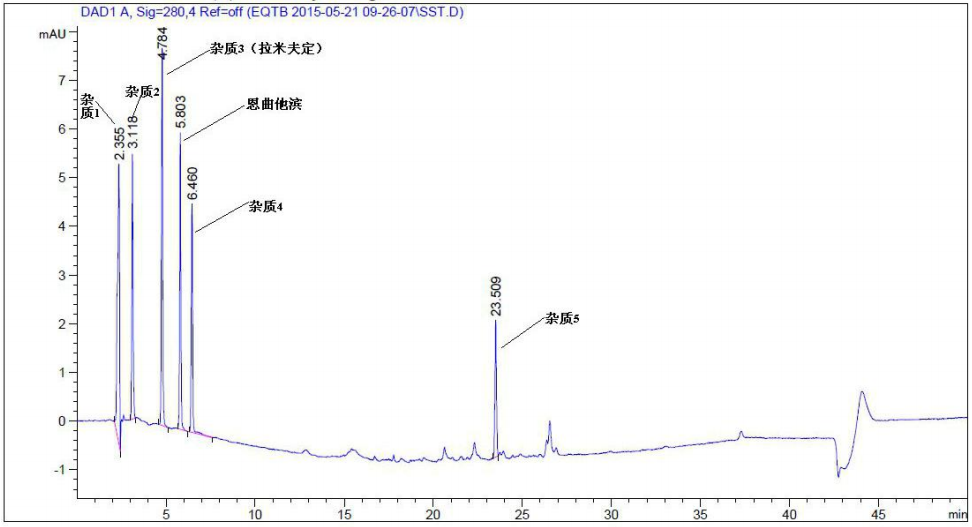 (恩曲他滨系统适用性溶液色谱图,色谱柱:Thermo C18,150×4.6mm,5μm)