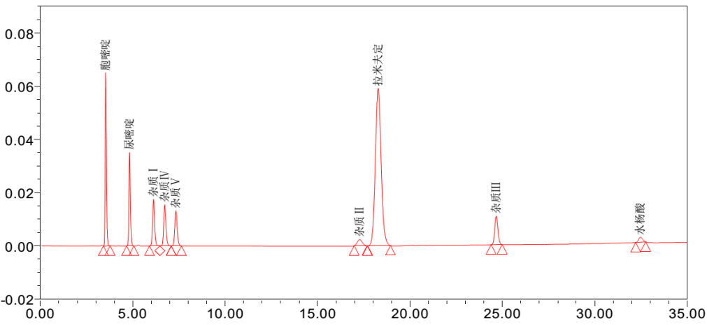 拉米夫定及其杂质(胞嘧啶、尿嘧啶、拉米夫定、水杨酸、拉米夫定杂质Ⅰ-Ⅴ)混合物色谱图