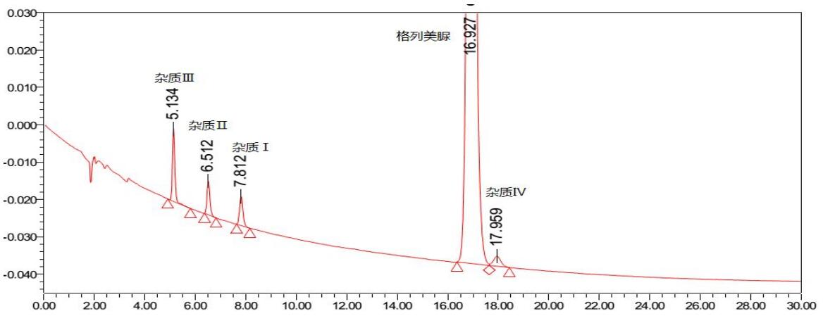 格列美脲及格列美脲杂质Ⅰ-Ⅳ混合溶液色谱图