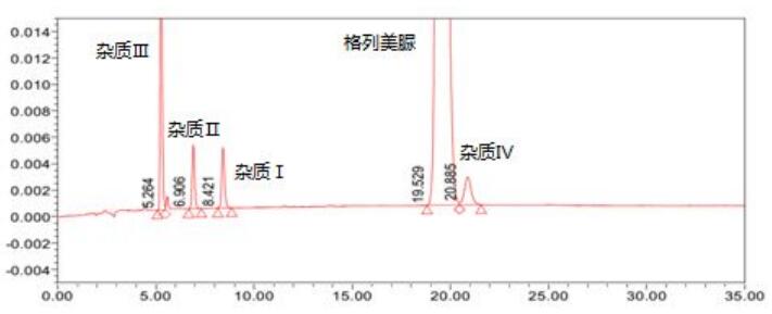 格列美脲及格列美脲杂质Ⅰ-Ⅳ混合溶液色谱图